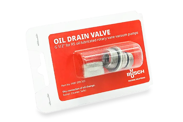 Сливной клапан Busch делает процедуру замены масла быстрой, чистой и безопасной. Просто вставьте силиконовый шланг и поверните его.