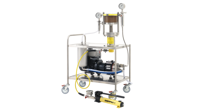 Установка представляет собой полностью интегрированную передвижную систему, состоящую из Alfa Laval LabStak® M20, насоса высокого давления, танка, теплообменника, клапанов, манометров и гидравлического ручного насоса для сжатия модуля.